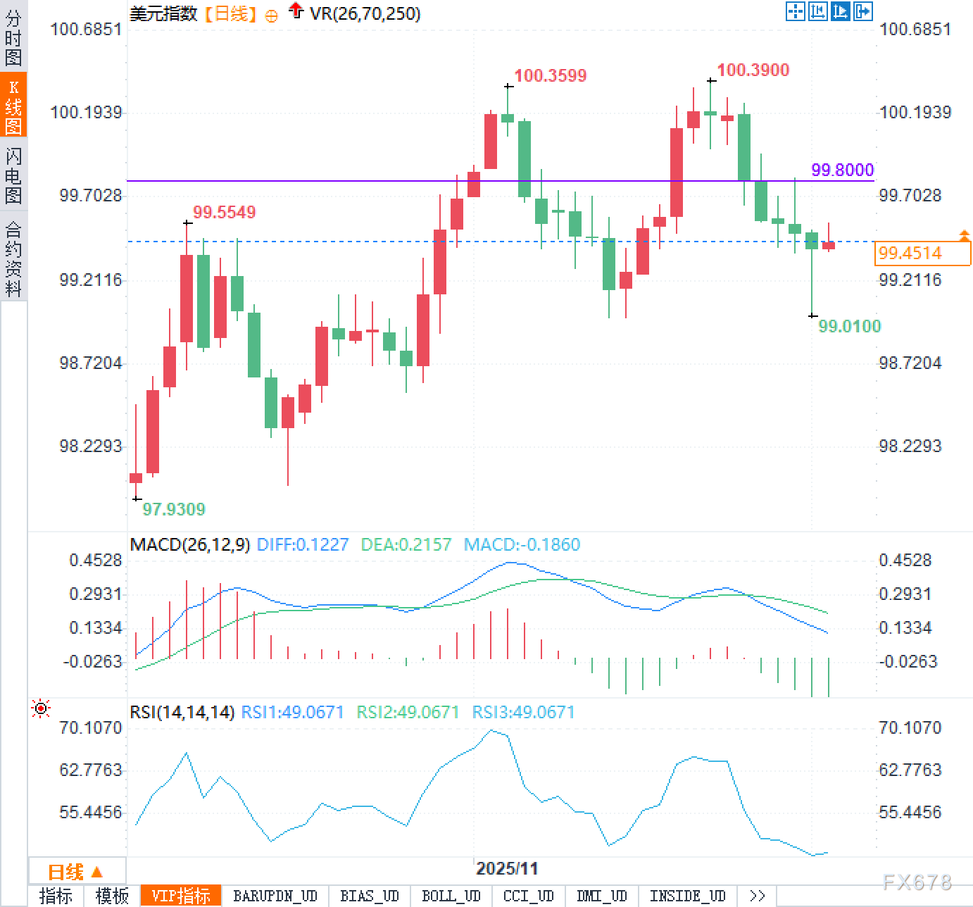 汇通财经APP讯——12月2日,星期二北美时段。当前美元指数交投99.45附近,维持在近两个月低位区间震荡。市场情绪整体偏谨慎,交易员在多重因素之间权衡取舍:一方面,美国制造业持续萎缩的数据再度强化了对美联储货币政策转向宽松的预期;另一方面,日本央行政策立场趋于鹰派,引发资本回流预期升温,间接支撑美债收益率走强,对美元形成一定托底作用。