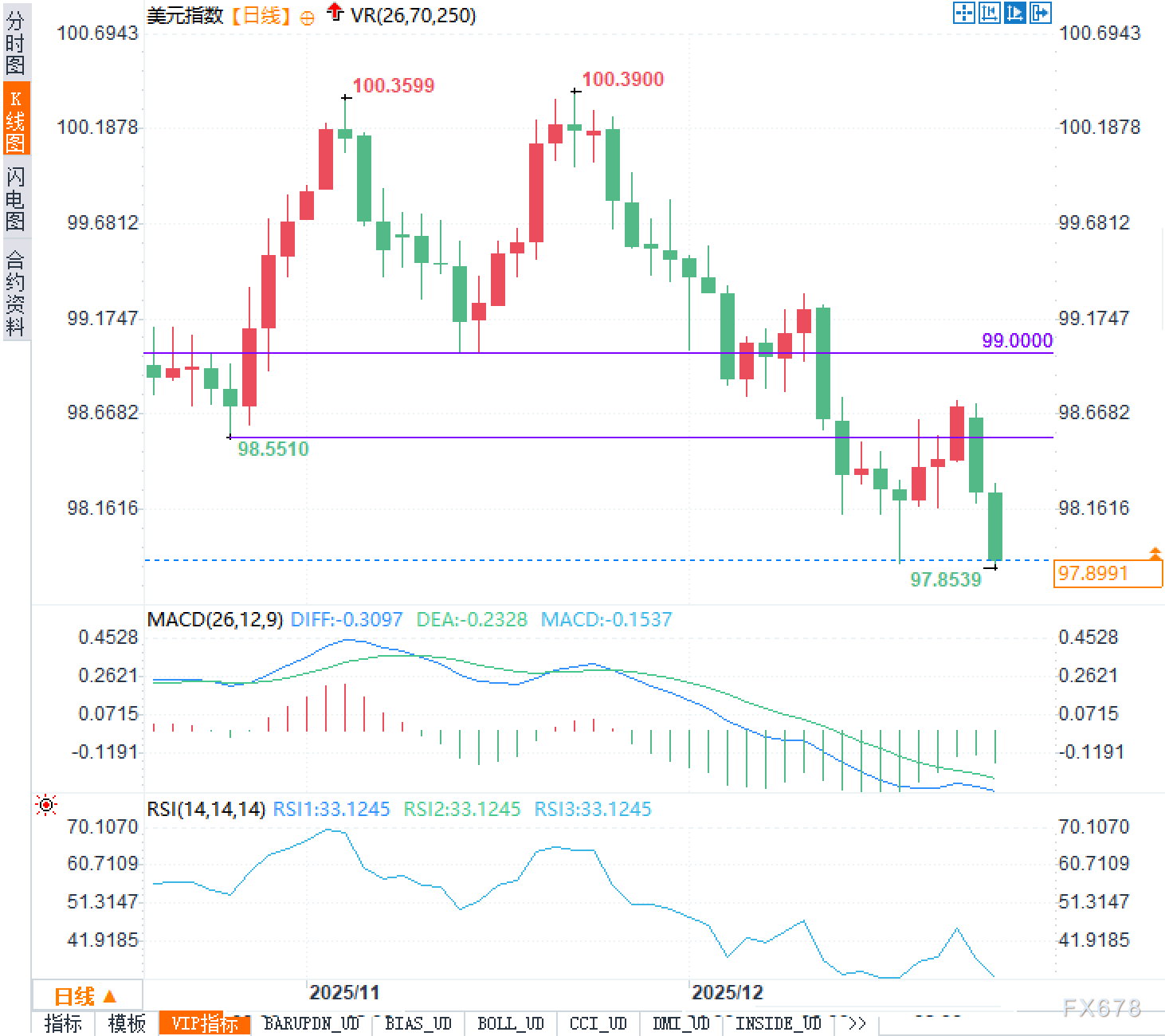 汇通财经APP讯——12月23日,星期二。外汇市场正处于年末交投清淡的特殊时段,冬季假期临近导致市场流动性明显收缩。在此背景下,美元指数近期呈现出显著的回调态势,从阶段性高点100.39附近持续走低,当前欧洲时段已跌至97.90一线附近,累计跌幅超过2%。