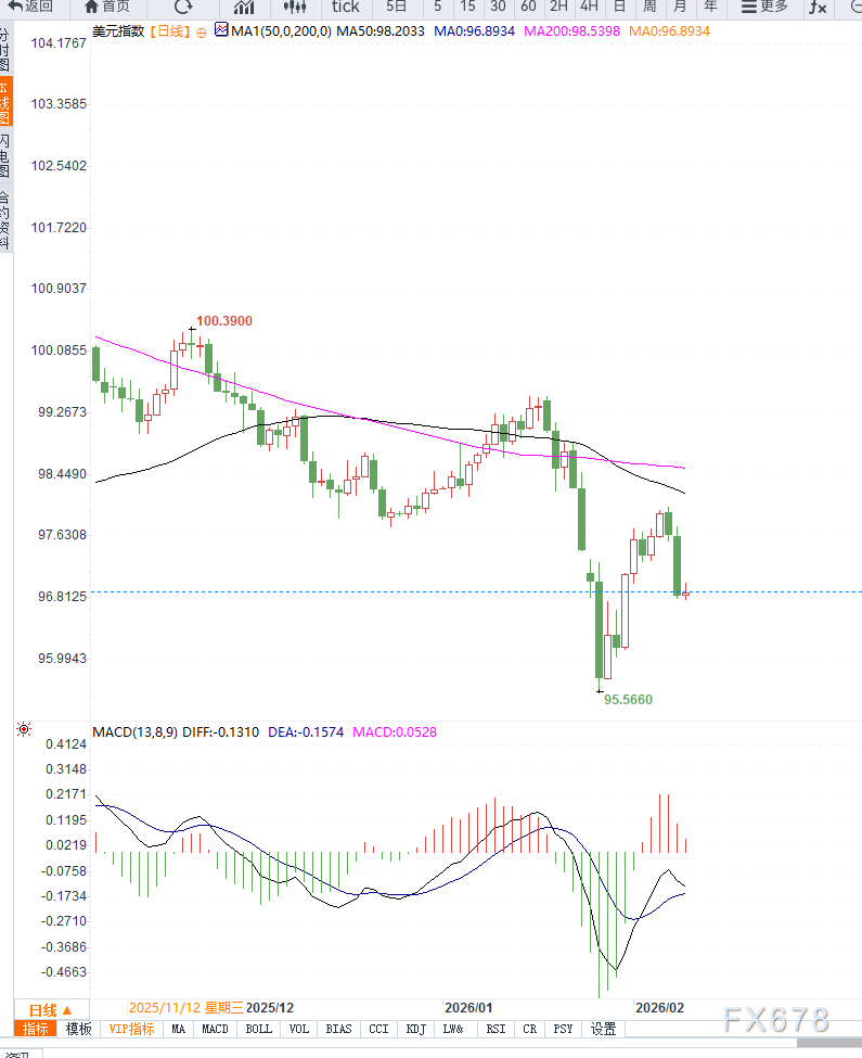 汇通财经APP讯——周二亚洲交易时段,美元指数(DXY)延续低位整理走势,连续第三个交易日未能有效反弹,当前运行于96.80附近。